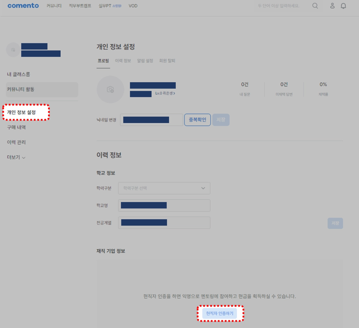 개인 정보 설정 탭에서 화면 하단의 현직자 인증하기 버튼을 클릭해주세요.