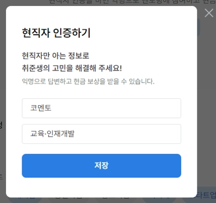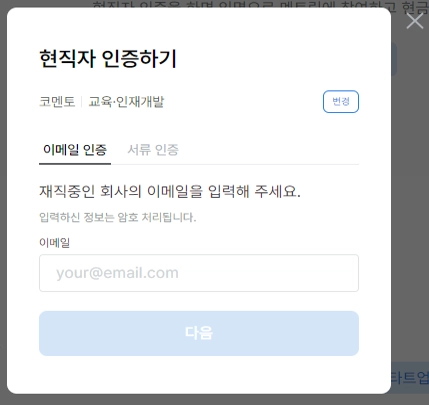 회사명 및 직무를 기입하고, 이메일 인증 또는 서류 인증으로 현직자 인증을 진행해주세요.