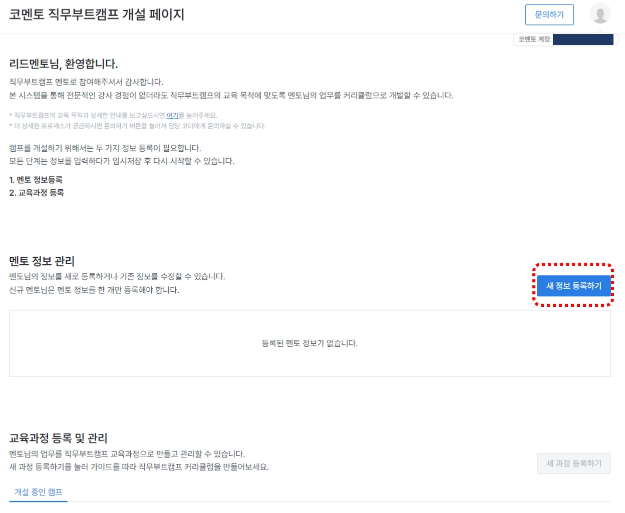 3) 멘토 등록> 캠프 개설 순으로 캠프 개설을 시작합니다.