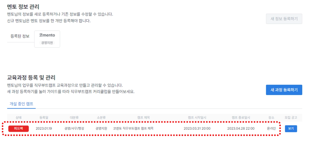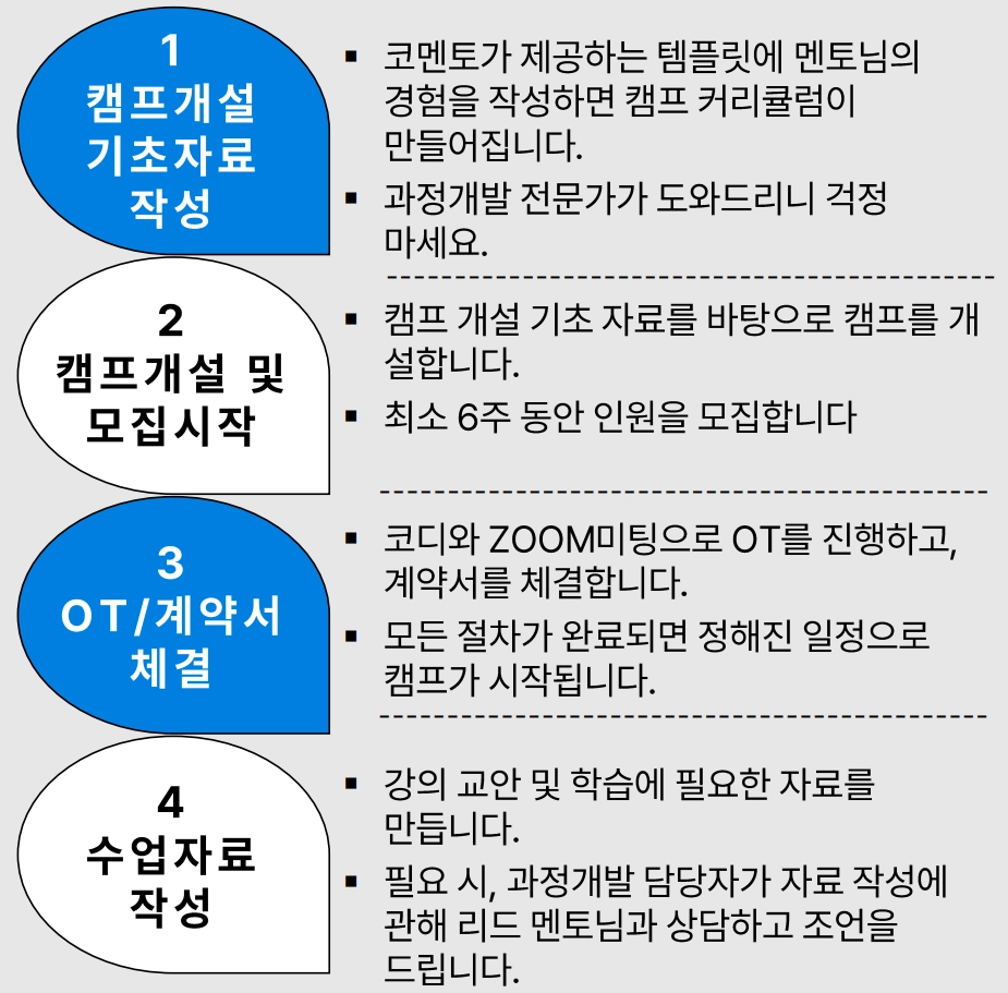 캠프개설 데이터를 코멘토 매니저가 검토 후, 멘토님과 협의해 캠프 모집 공고를 개설합니다.